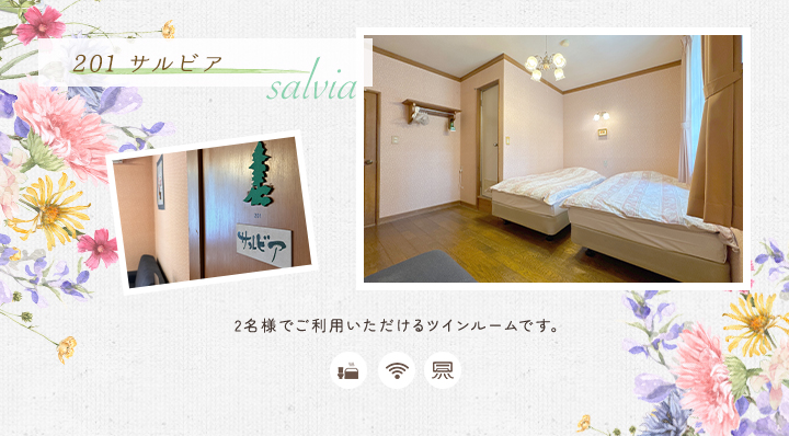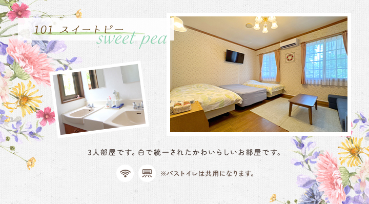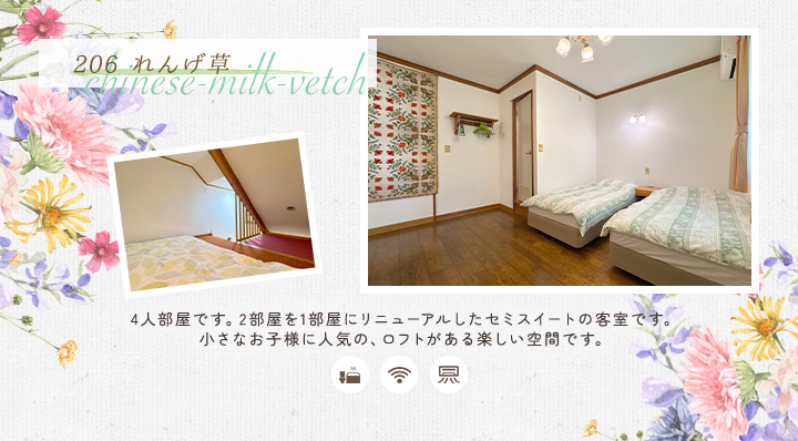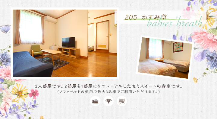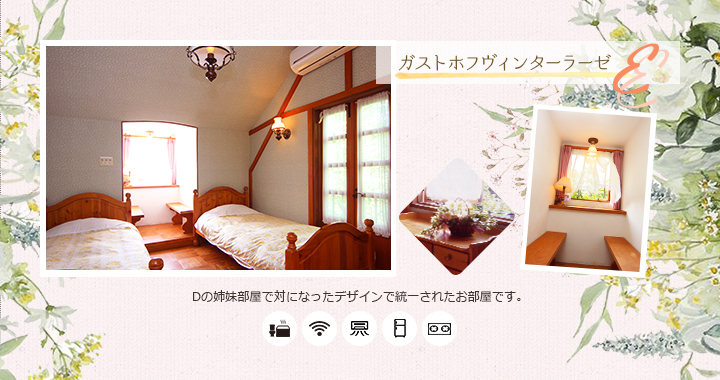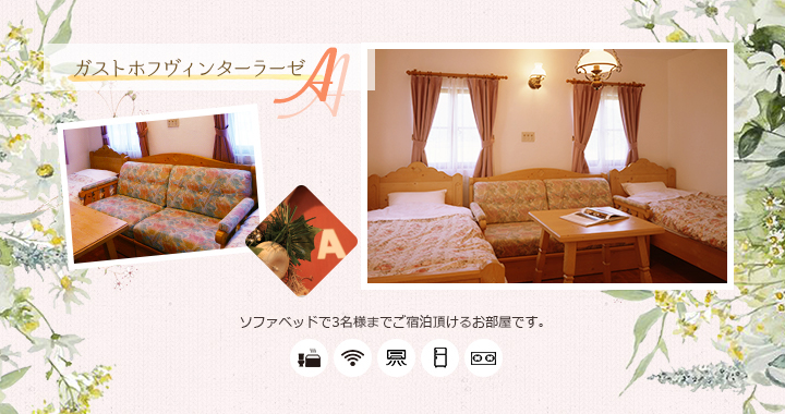 | 共有施設 | 駐車場完備、テニスコート、自動販売機、乾燥室、洗濯機、電子レンジ、冷蔵庫 ※テニスコートは5月上旬~10月下旬。ご宿泊者様は無料でご利用いただけます。 |